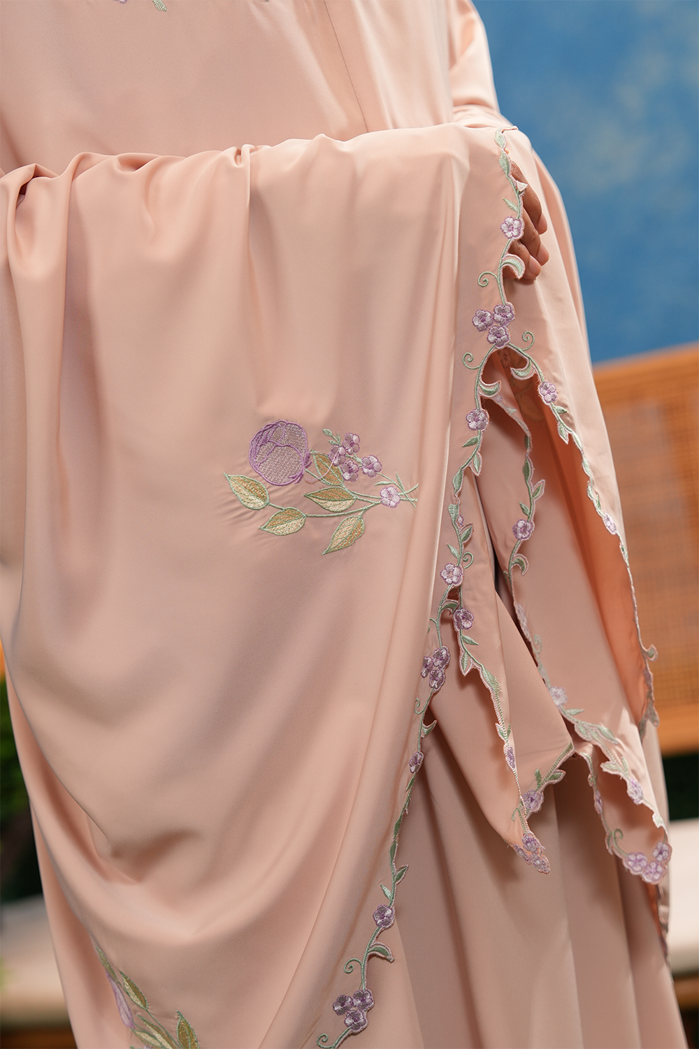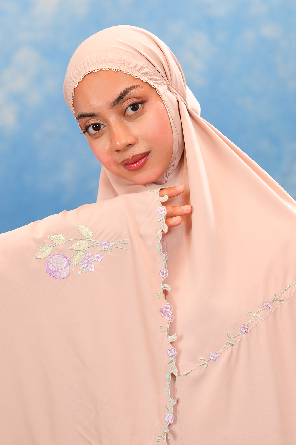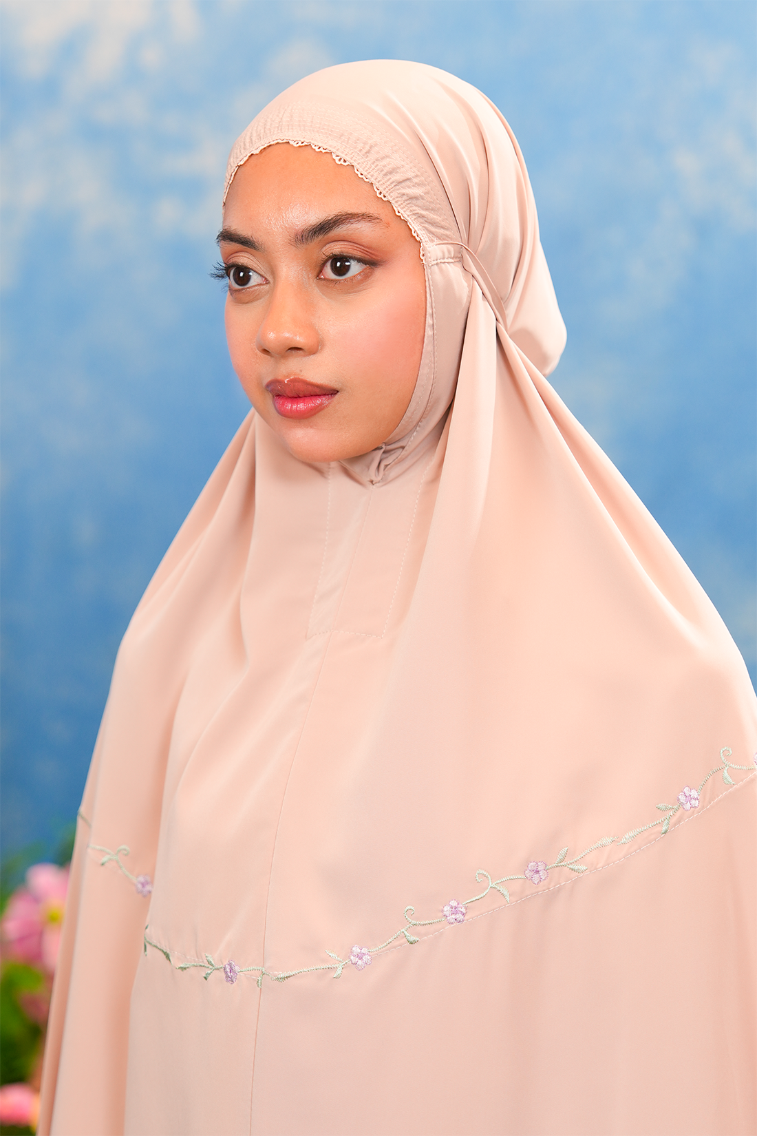 The Aurora Telekung is adorned with minimalist tulip florals in gentle pastel hues – reflects the simplicity of everyday moments — tulips that softly symbolise your day, calm, gentle, and unfolding at its own pace. Designed for those who appreciate subtle beauty, it carries a sense of calm femininity and timeless charm through refined, understated details.