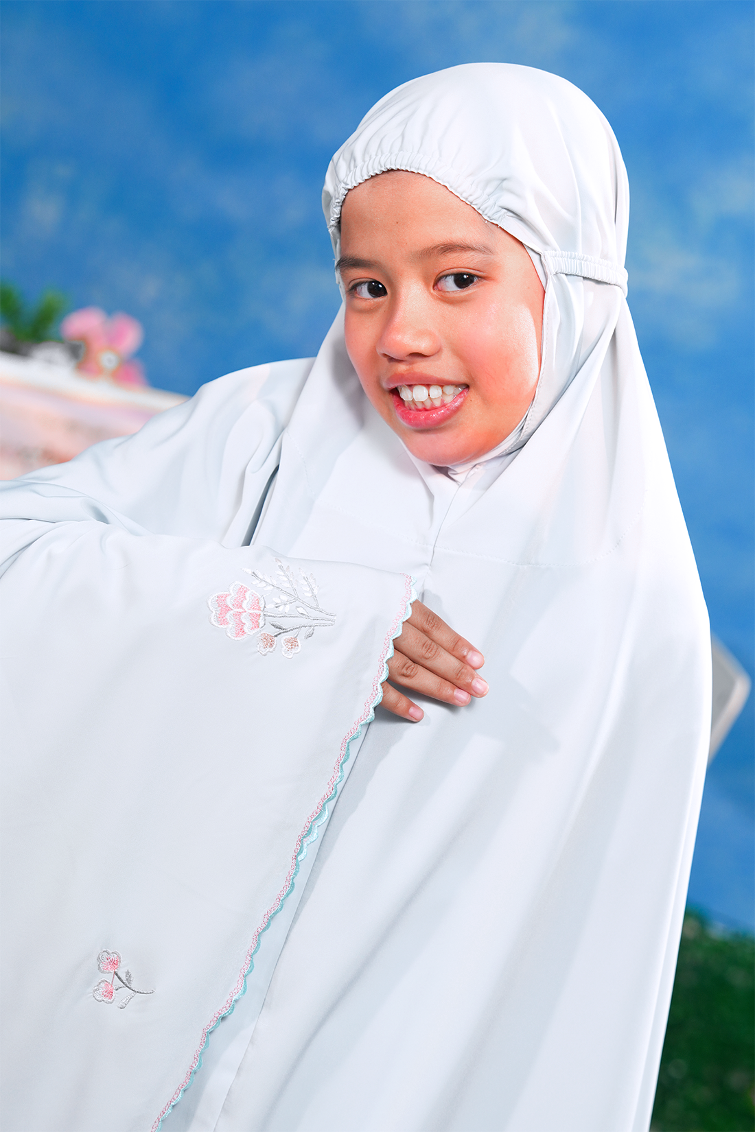 Little Eleanor Telekung is delicately adorned with modern floral embroidery ,where tiny, graceful motifs bloom gently across the fabric—evoking elegance, and a sense of calm. Designed to complement Mommy’s Eleanor Telekung, it creates a beautiful mother-and-child matching set, perfect for shared moments of prayer. Like a flower in its earliest bloom, Little Eleanor reflects the gentle nurturing of mindfulness and love in every child’s prayer.