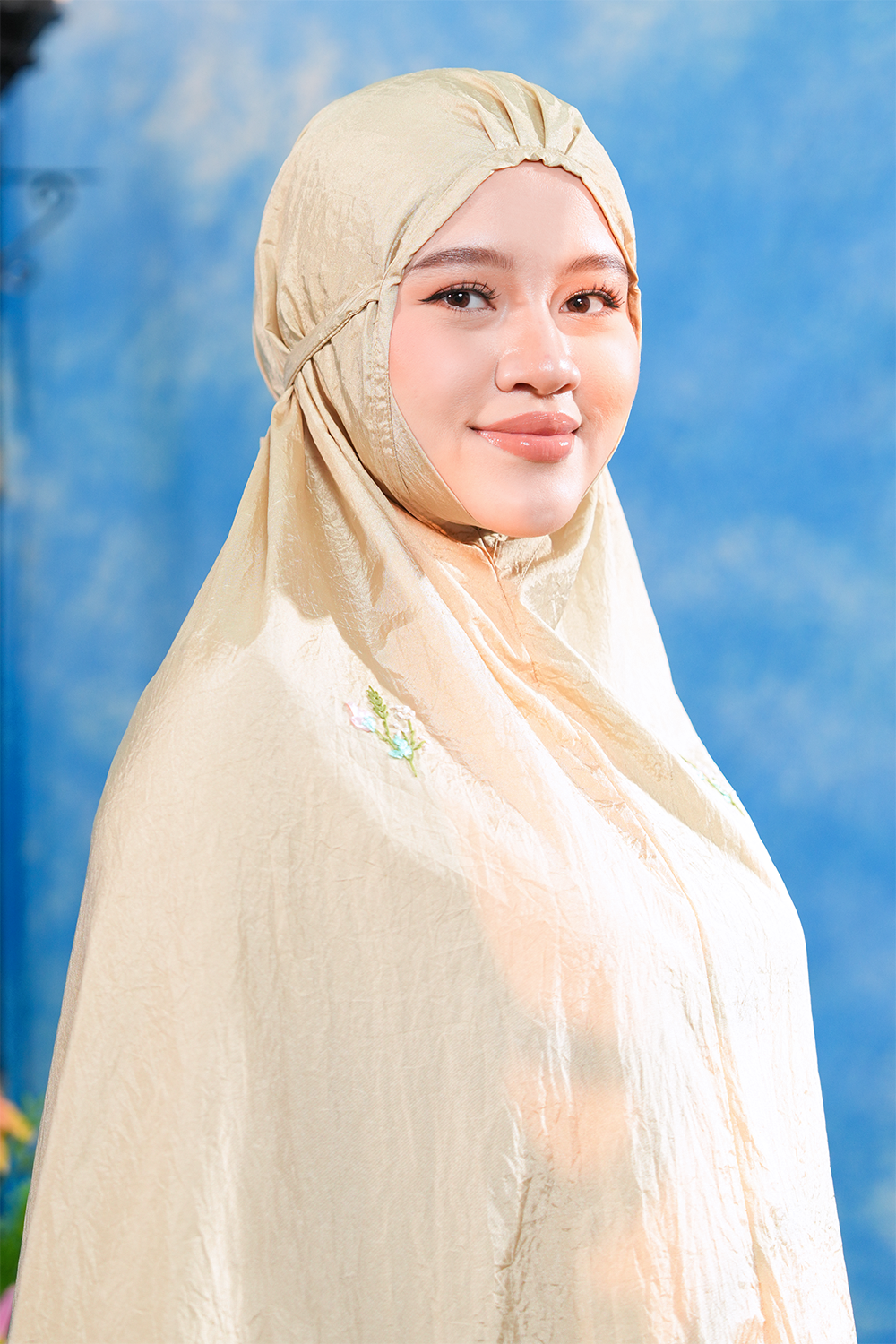 The telekung features delicate blooming flower embroidery, handcrafted using the satin ribbon embroidery technique, adding a gentle and feminine touch.