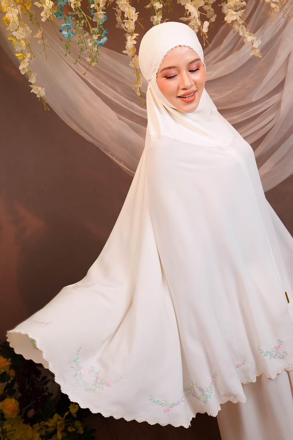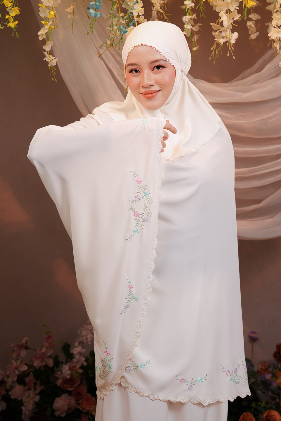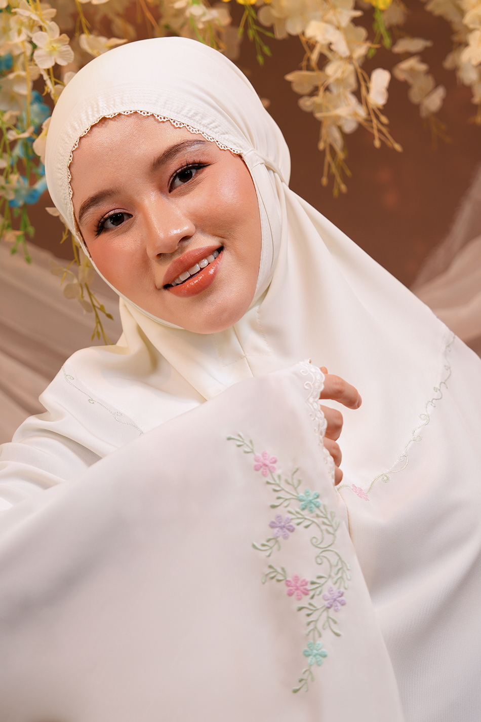 Celine Telekung embodies elegance in simplicity, highlighted by its modern embroidery — a delicate wreath of pastel blossoms and leafy vines forming a soft circular motif. The design symbolises serenity, beautifully blending nature’s calm hues.