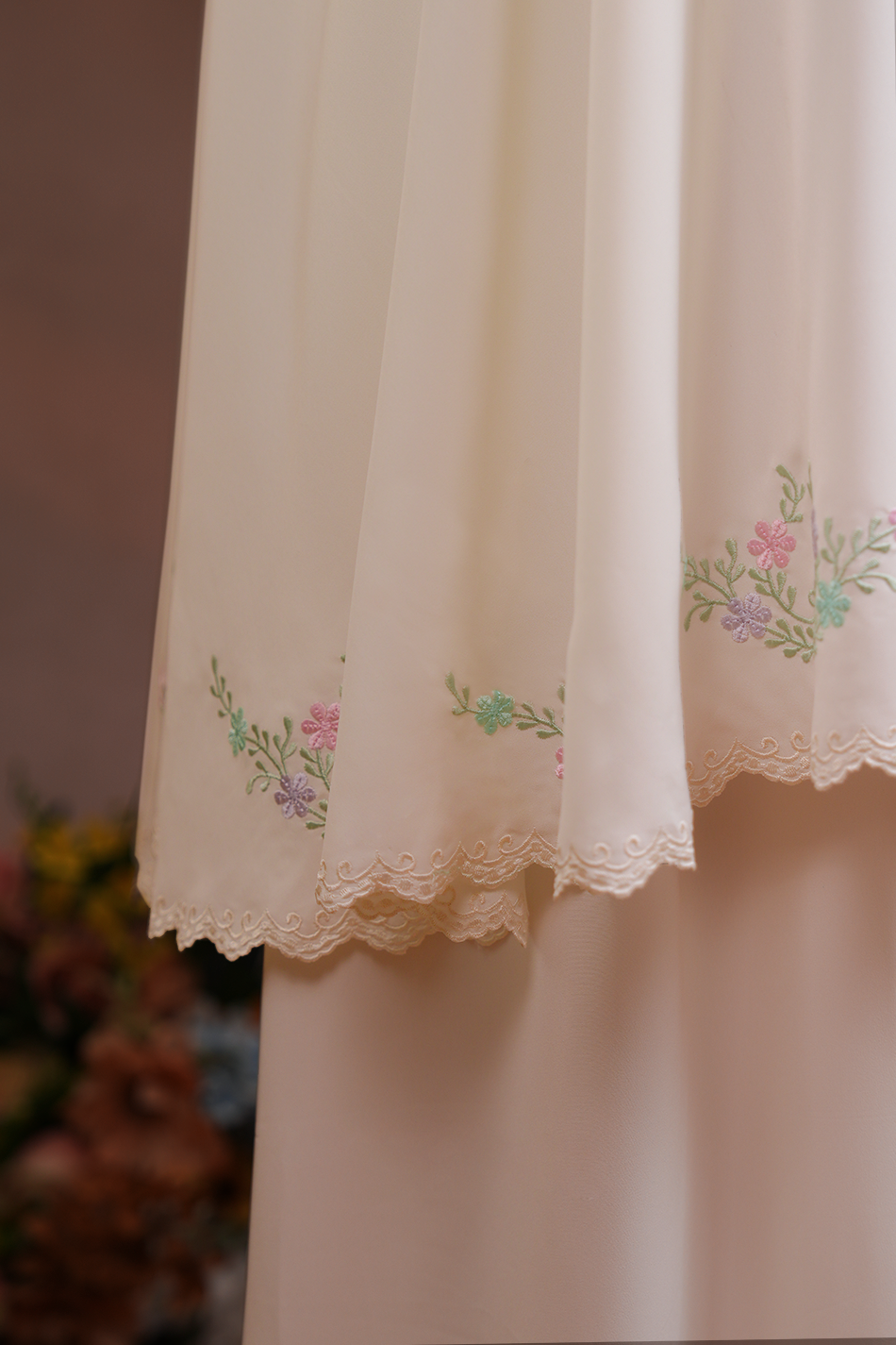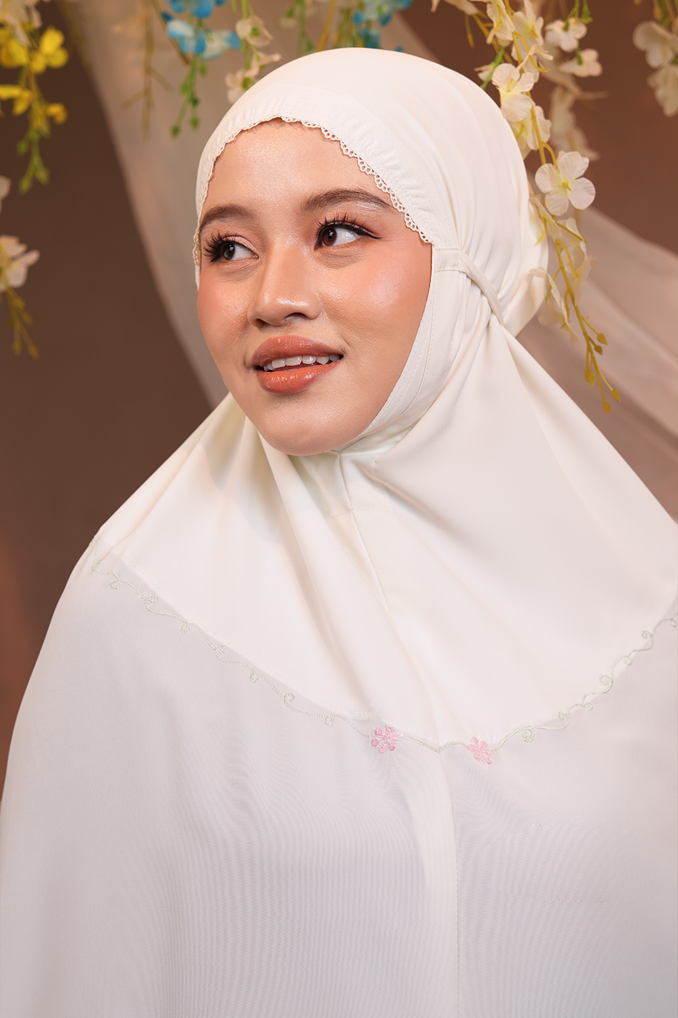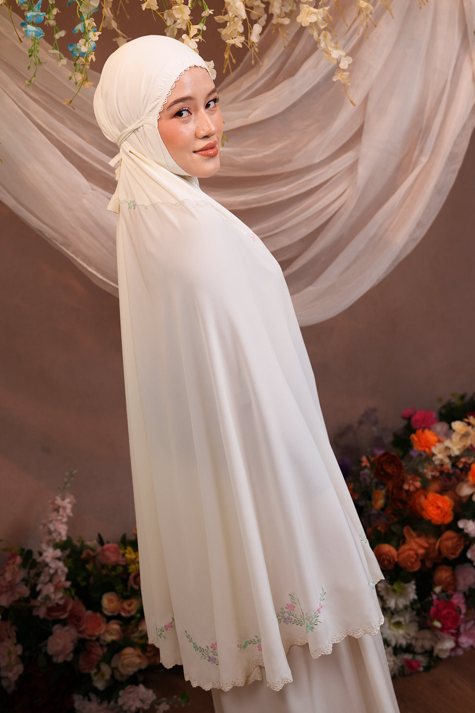 Celine Telekung embodies elegance in simplicity, highlighted by its modern embroidery — a delicate wreath of pastel blossoms and leafy vines forming a soft circular motif. The design symbolises serenity, beautifully blending nature’s calm hues.