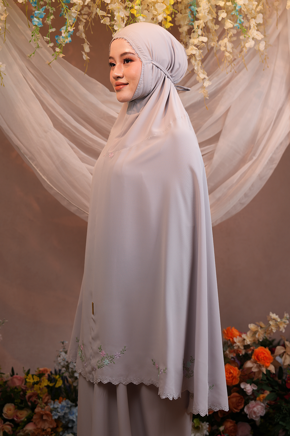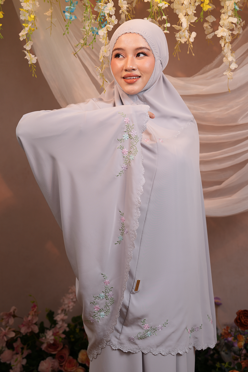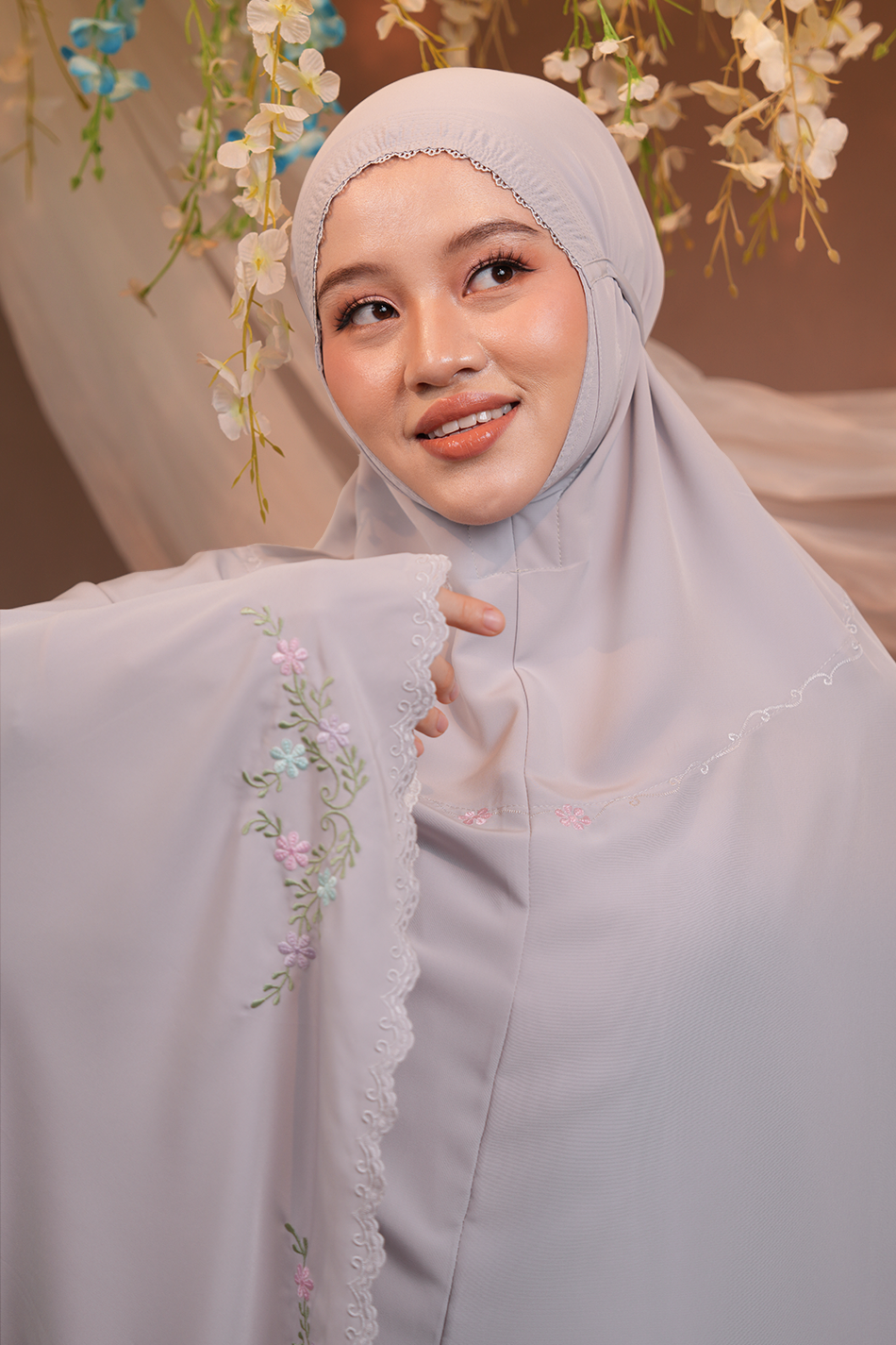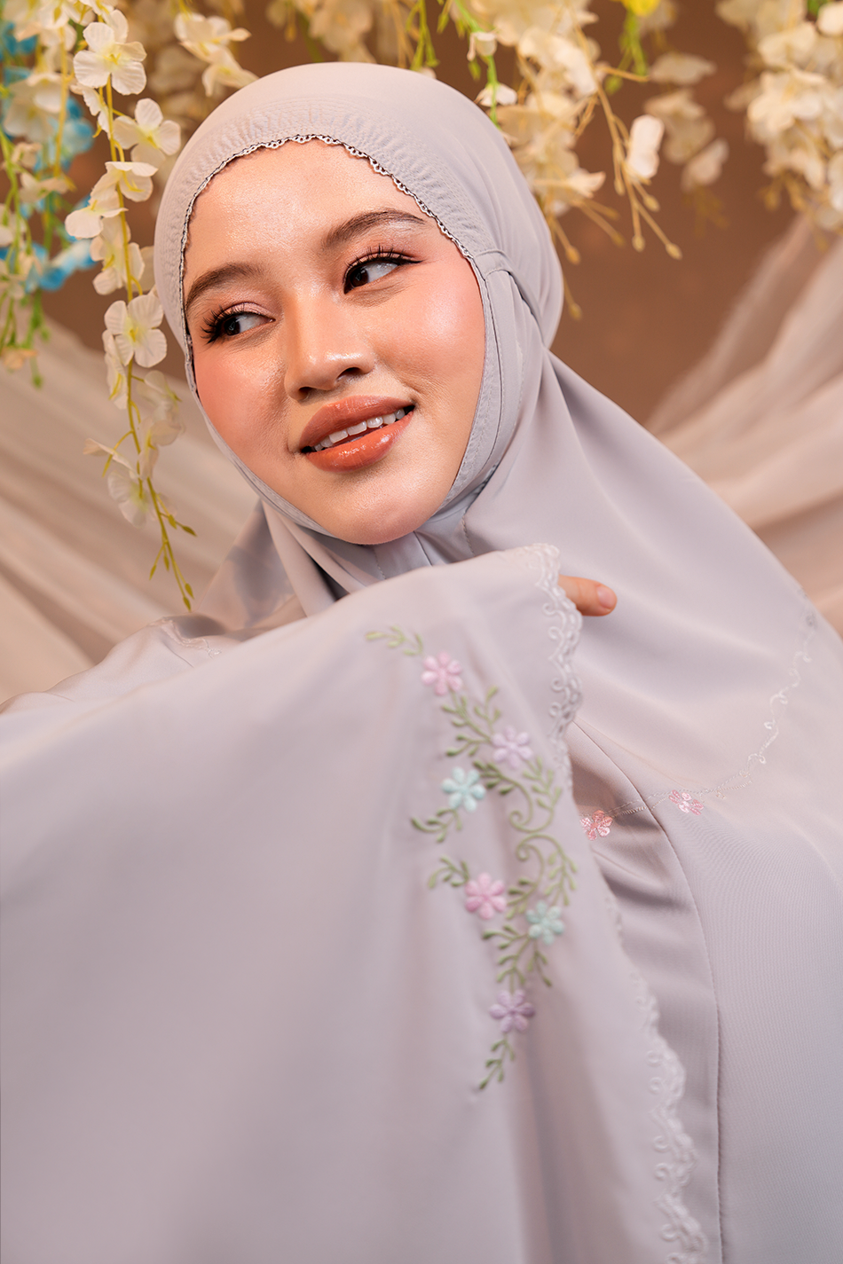 Celine Telekung embodies elegance in simplicity, highlighted by its modern embroidery — a delicate wreath of pastel blossoms and leafy vines forming a soft circular motif. The design symbolises serenity, beautifully blending nature’s calm hues.