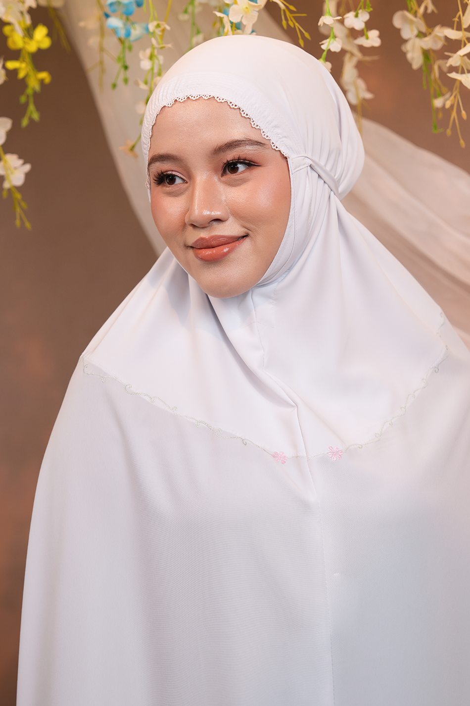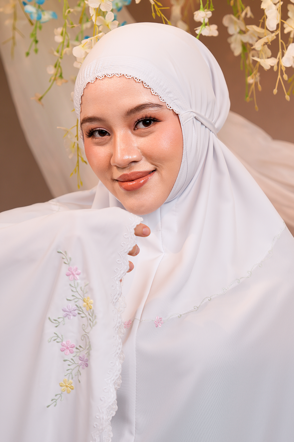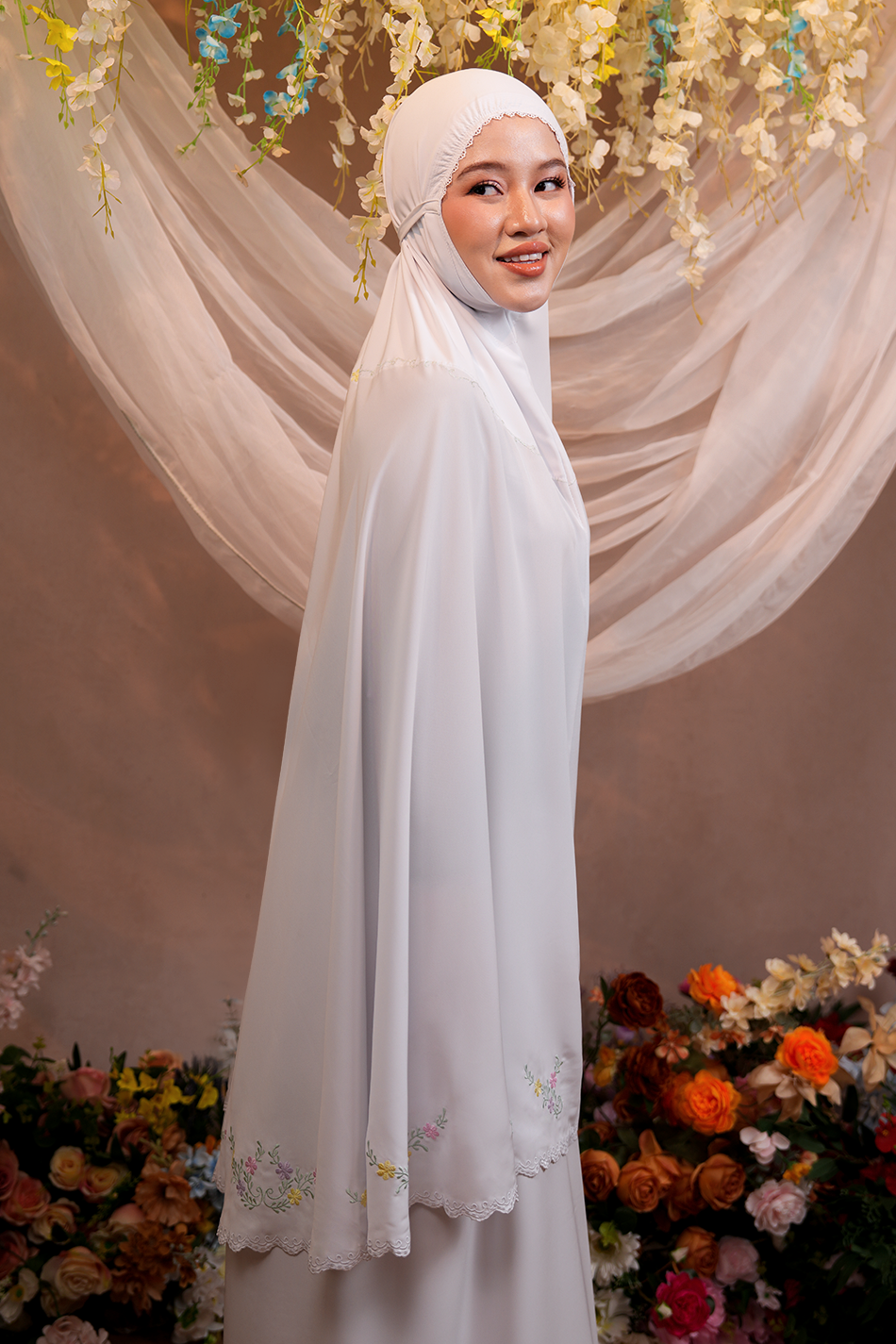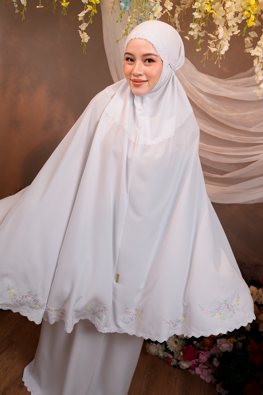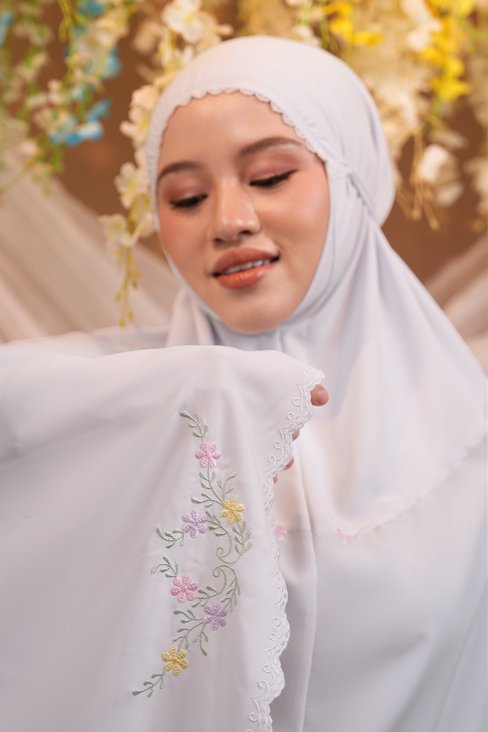 Celine Telekung embodies elegance in simplicity, highlighted by its modern embroidery — a delicate wreath of pastel blossoms and leafy vines forming a soft circular motif. The design symbolises serenity, beautifully blending nature’s calm hues.