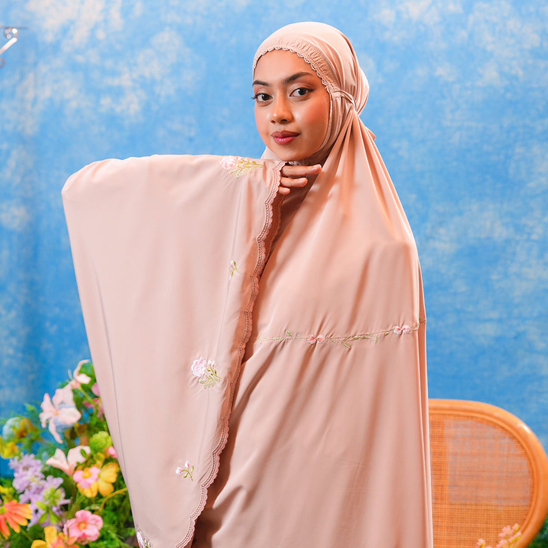 The Eleanor Telekung is adorned with delicate modern embroidery where small, graceful floral motifs bloom gently across the fabric, reflecting elegance, simplicity, and a sense of inner calm. Like a newly blossomed flower, it mirrors the quiet growth of peace and mindfulness in every movement of prayer.