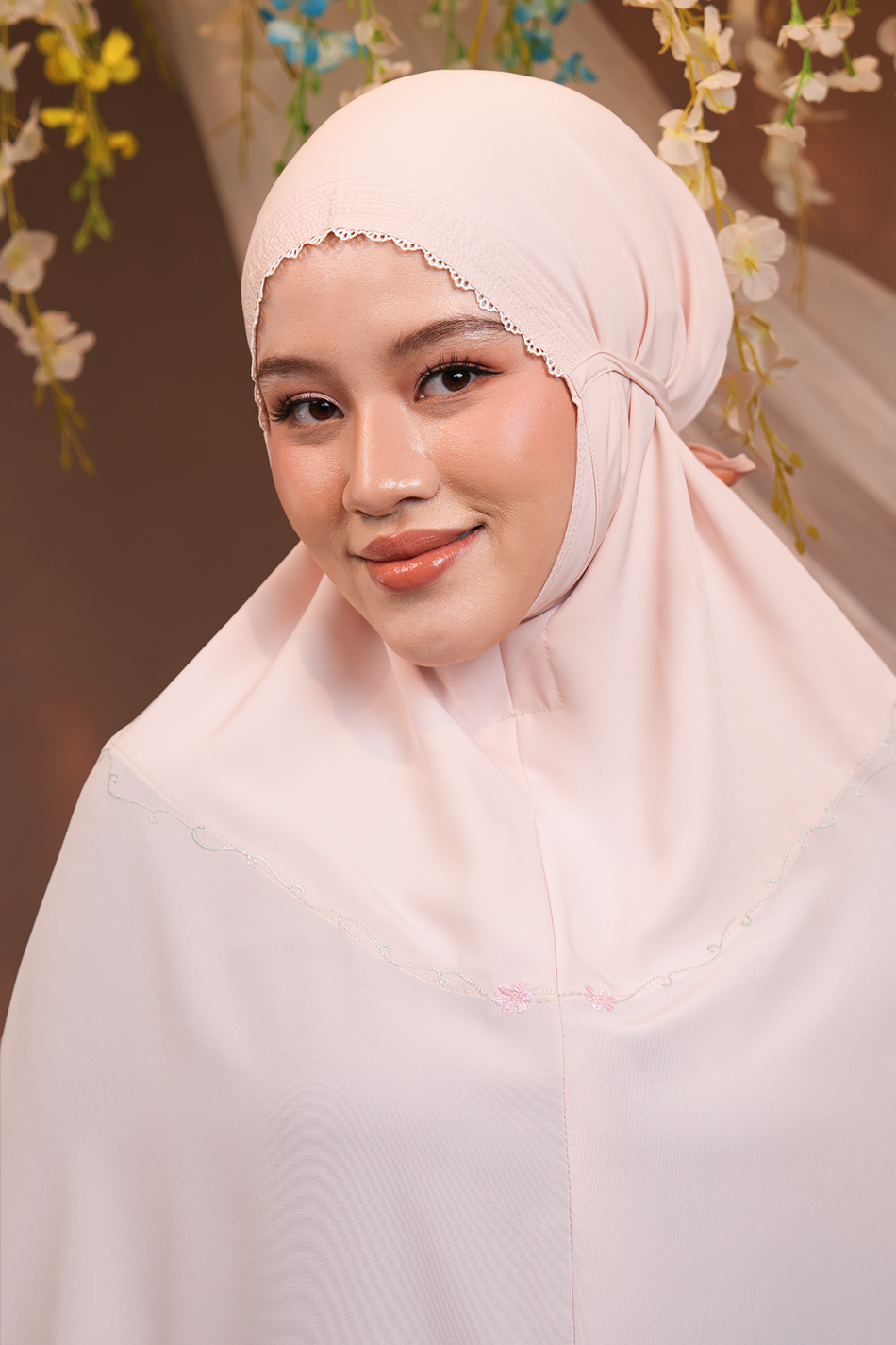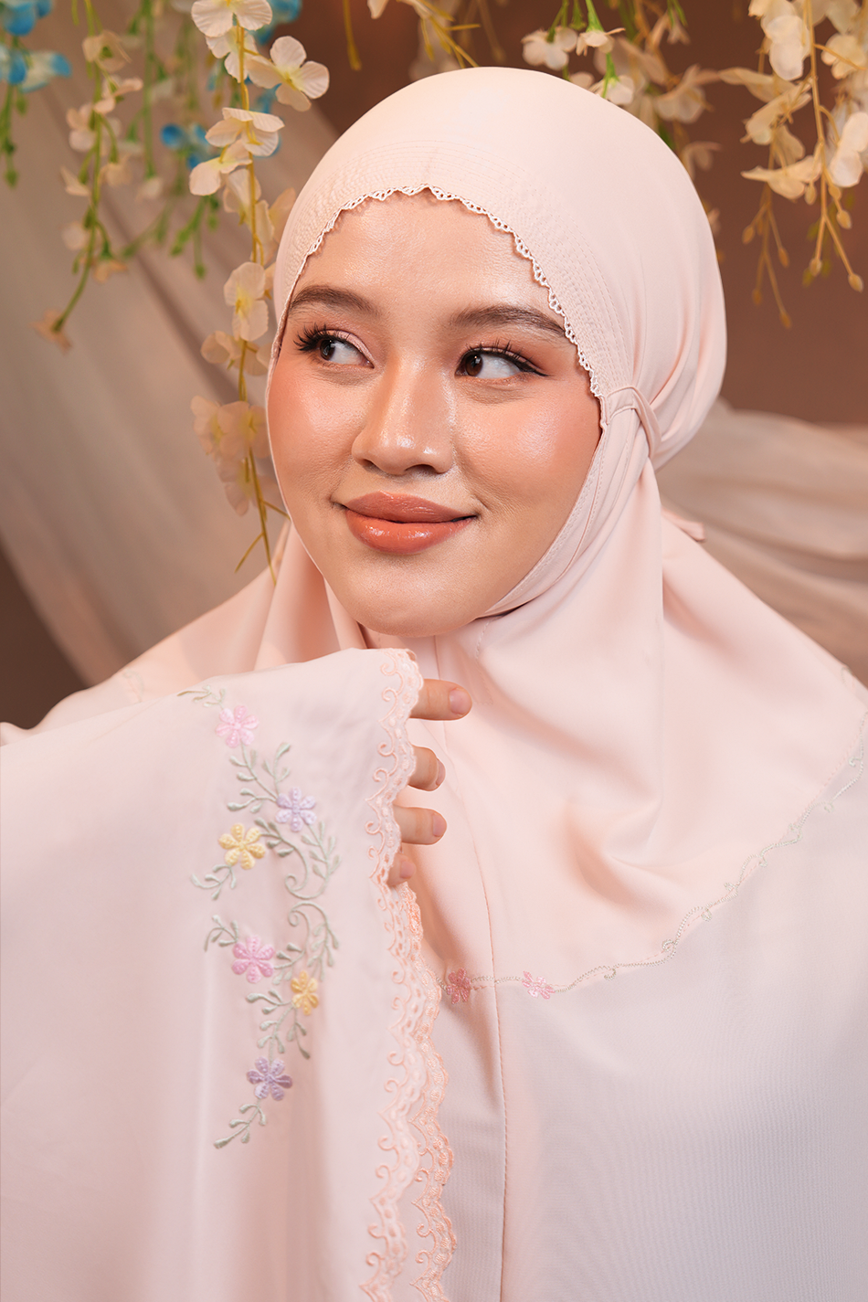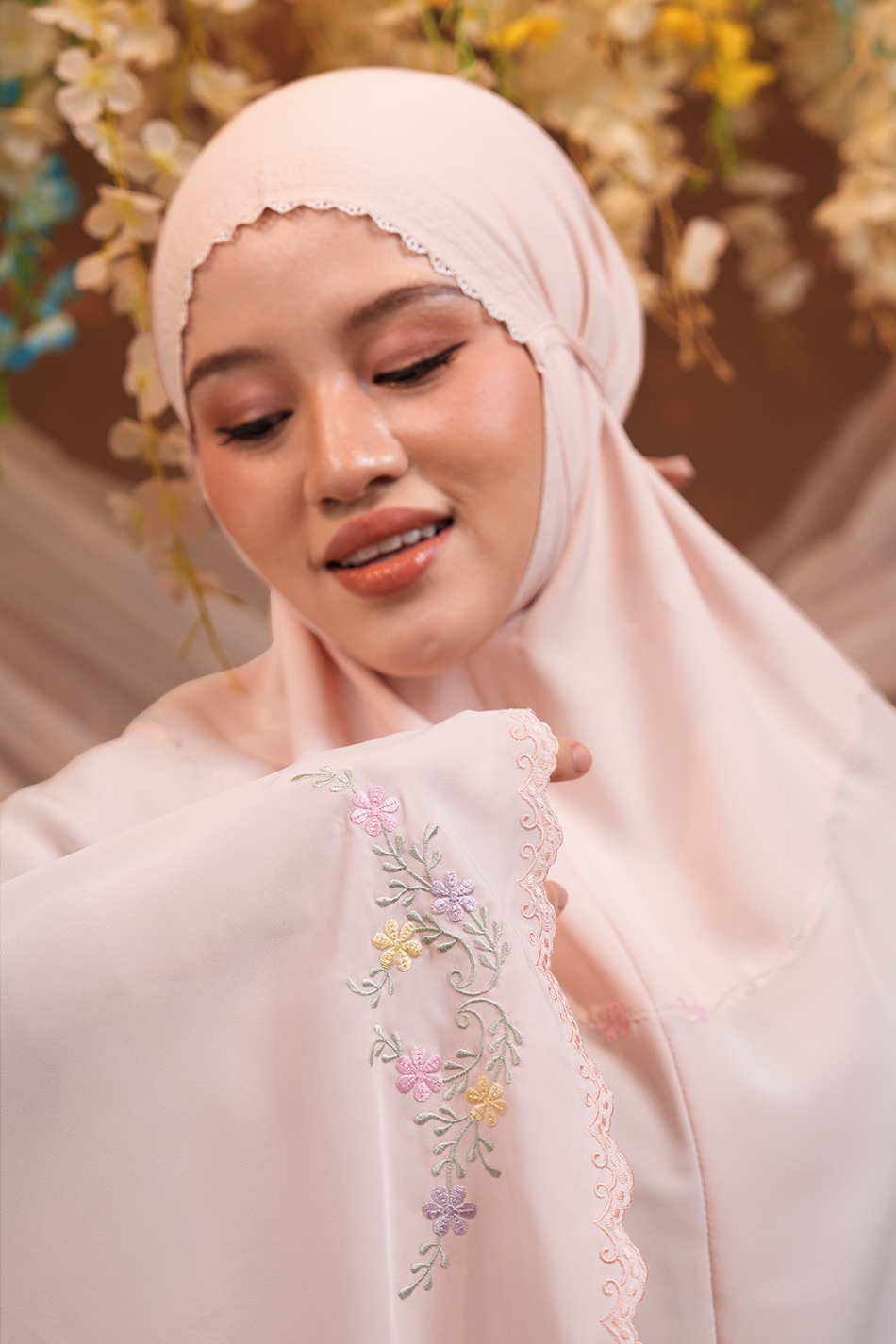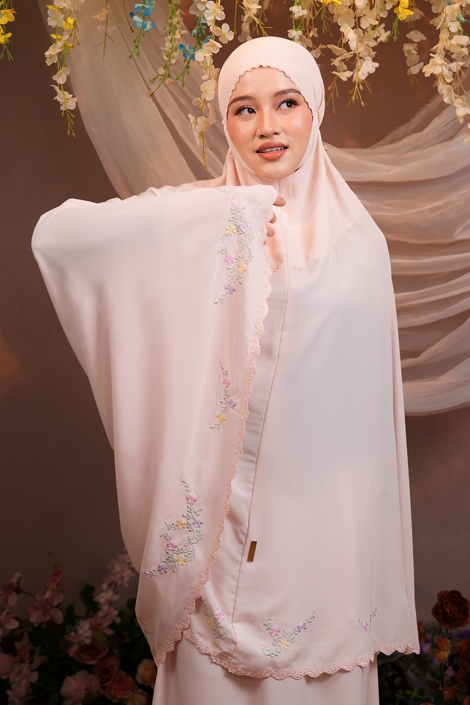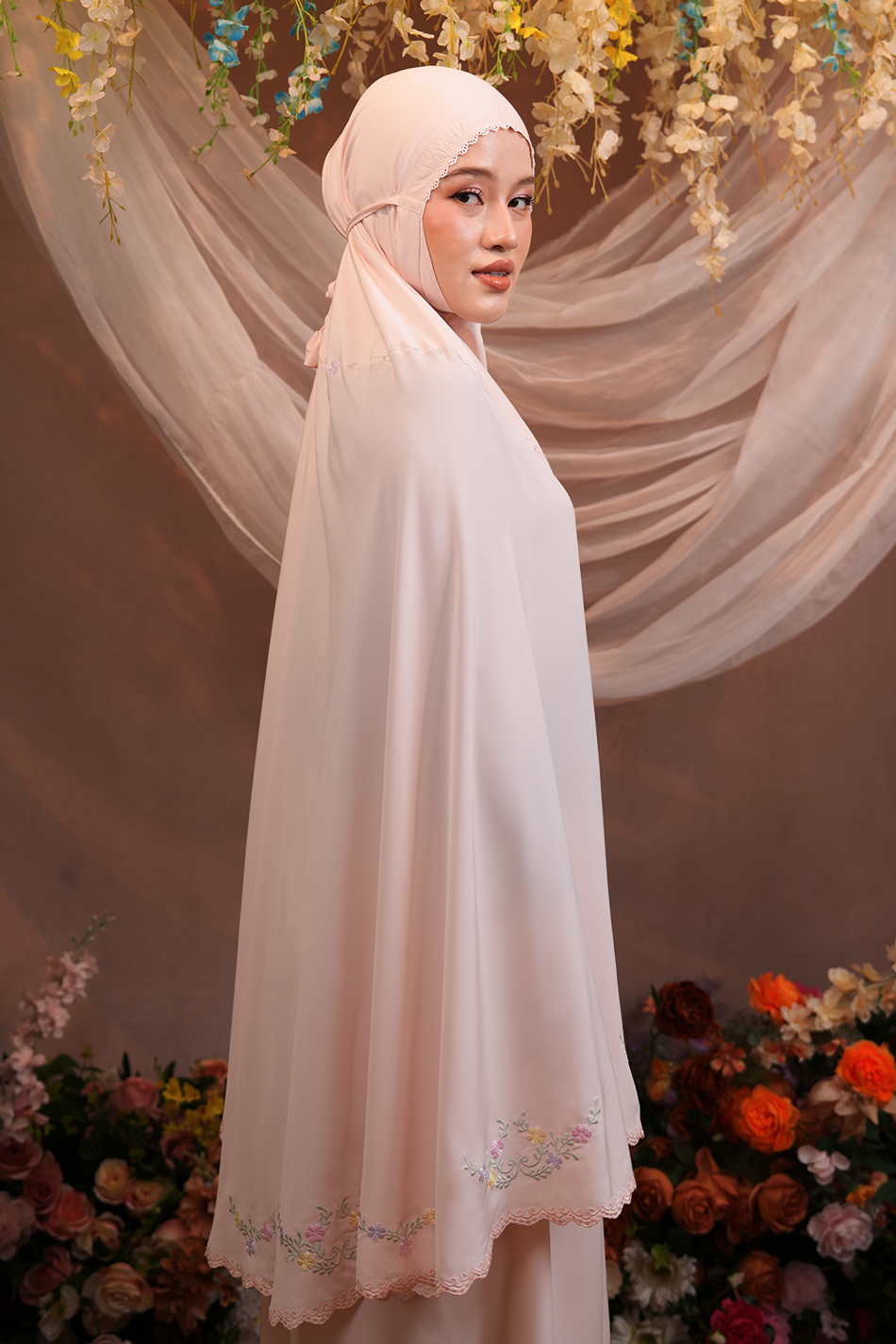 Celine Telekung embodies elegance in simplicity, highlighted by its modern embroidery — a delicate wreath of pastel blossoms and leafy vines forming a soft circular motif. The design symbolises serenity, beautifully blending nature’s calm hues.