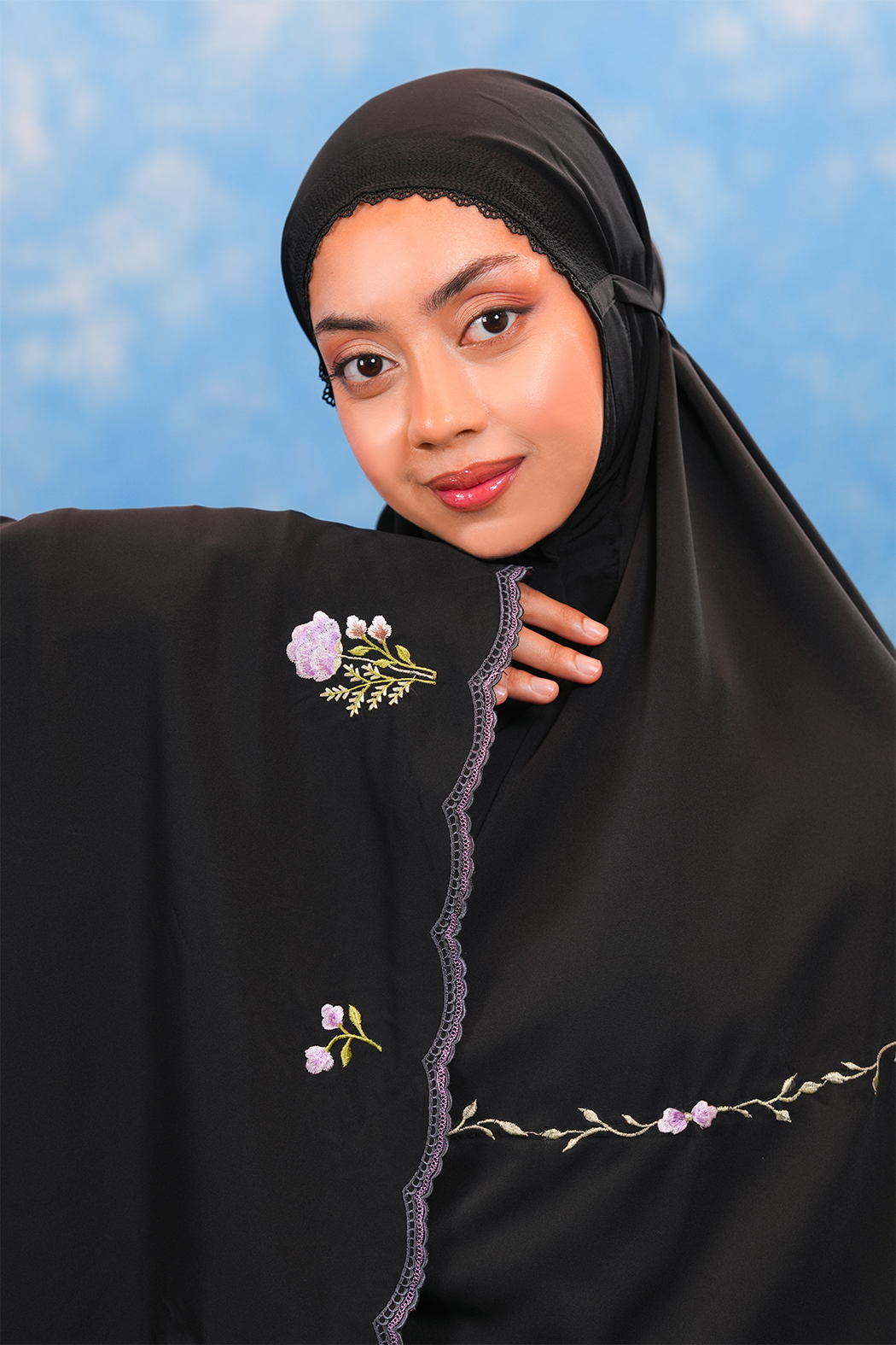 The Eleanor Telekung is adorned with delicate modern embroidery where small, graceful floral motifs bloom gently across the fabric, reflecting elegance, simplicity, and a sense of inner calm. Like a newly blossomed flower, it mirrors the quiet growth of peace and mindfulness in every movement of prayer.