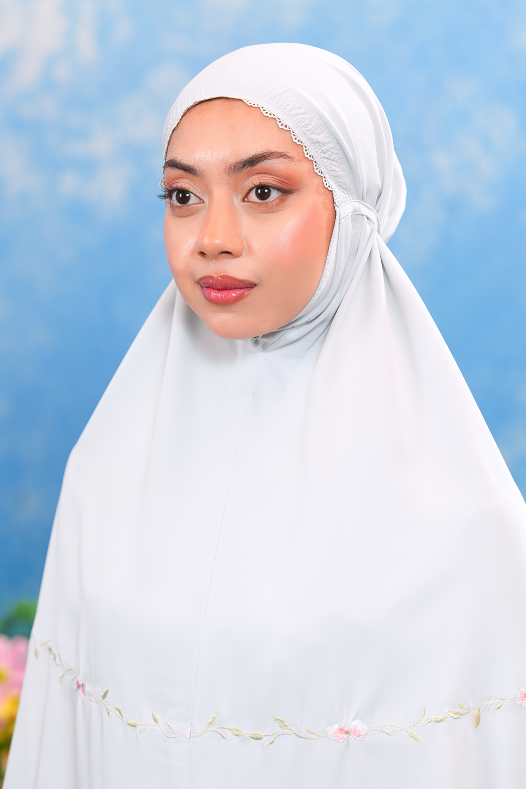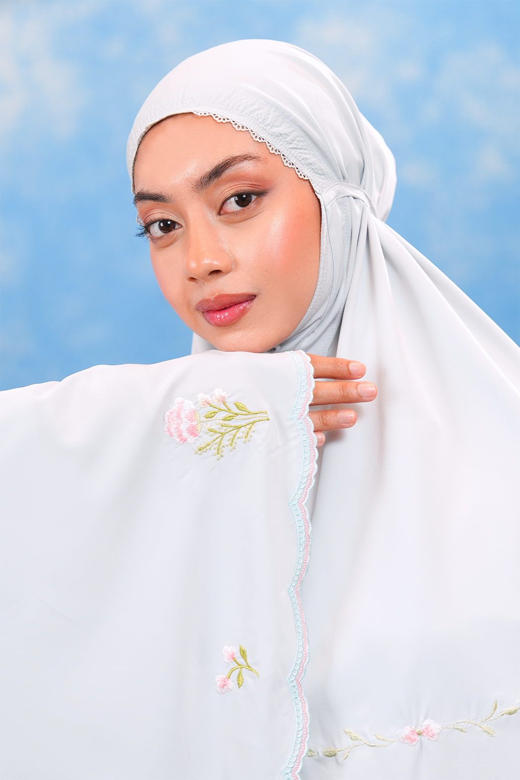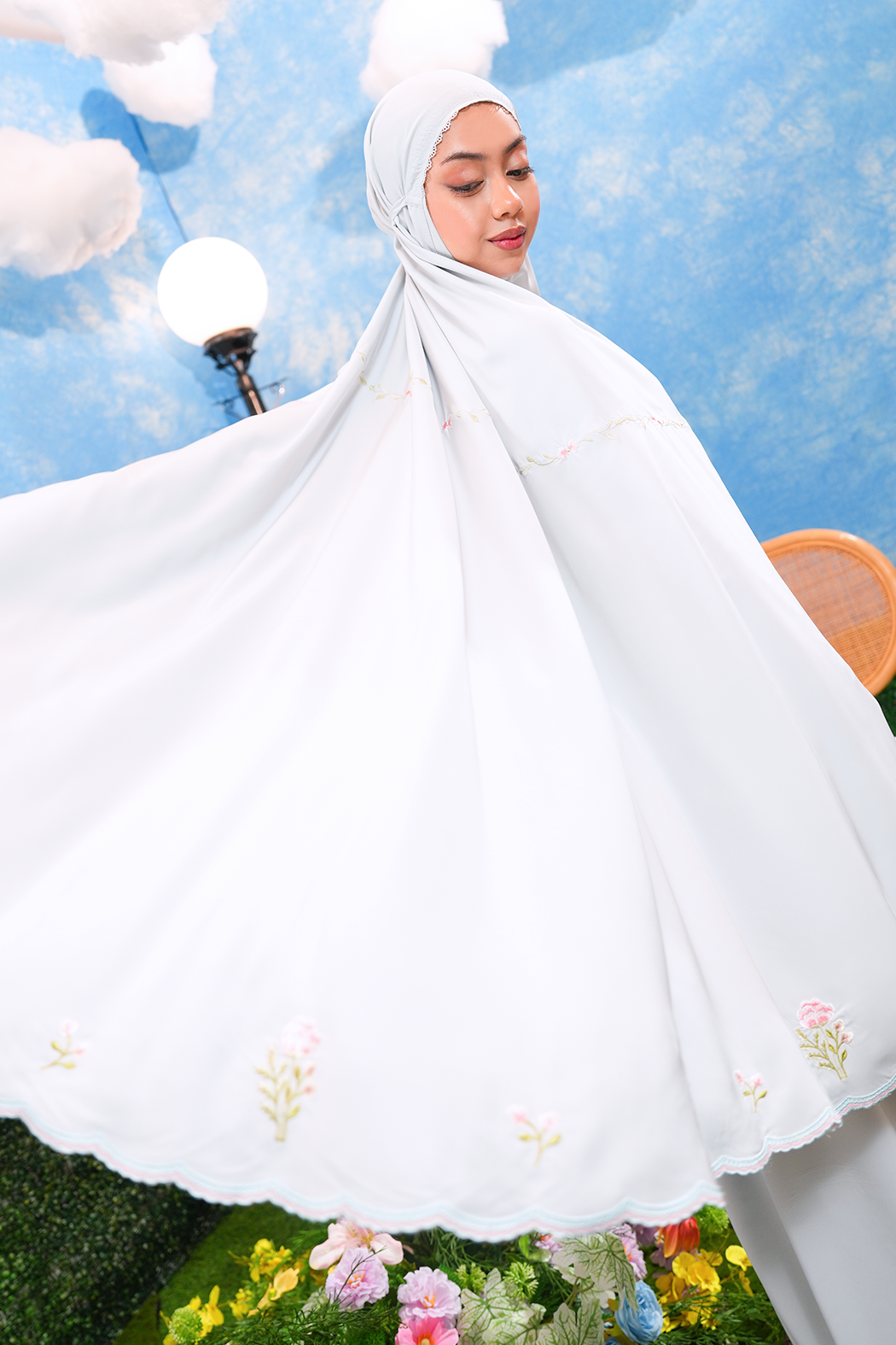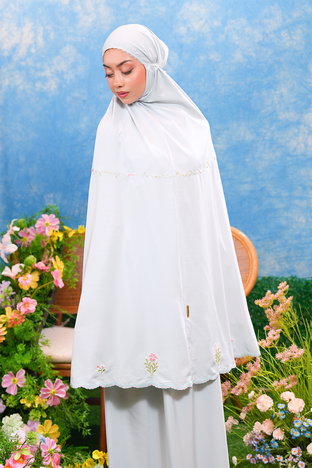 The Eleanor Telekung is adorned with delicate modern embroidery where small, graceful floral motifs bloom gently across the fabric, reflecting elegance, simplicity, and a sense of inner calm. Like a newly blossomed flower, it mirrors the quiet growth of peace and mindfulness in every movement of prayer.