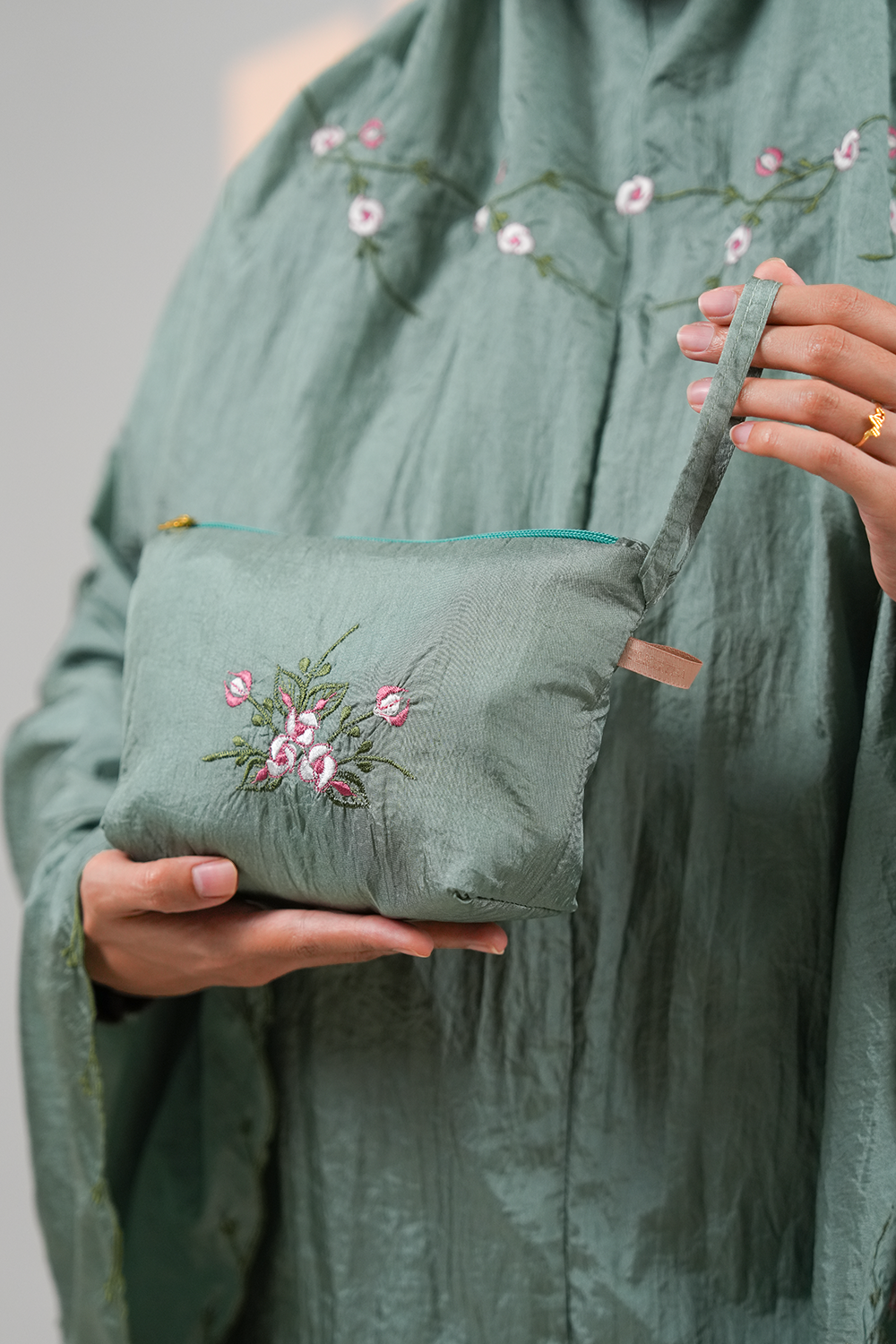 The telekung is decorated with delicate rosebud embroidery, giving it a sweet feminine touch. The smocked headband provides a secure yet comfortable fit, and it comes with a matching travel bag for easy storage and portability. Perfect for travel, work, or daily use, this telekung combines beauty with convenience.