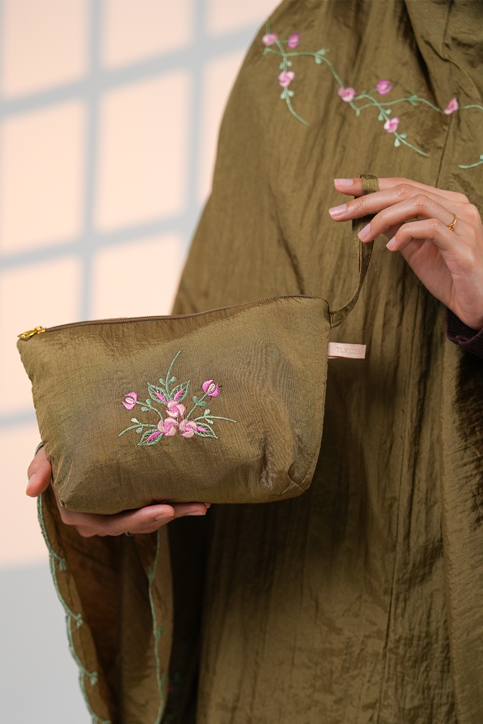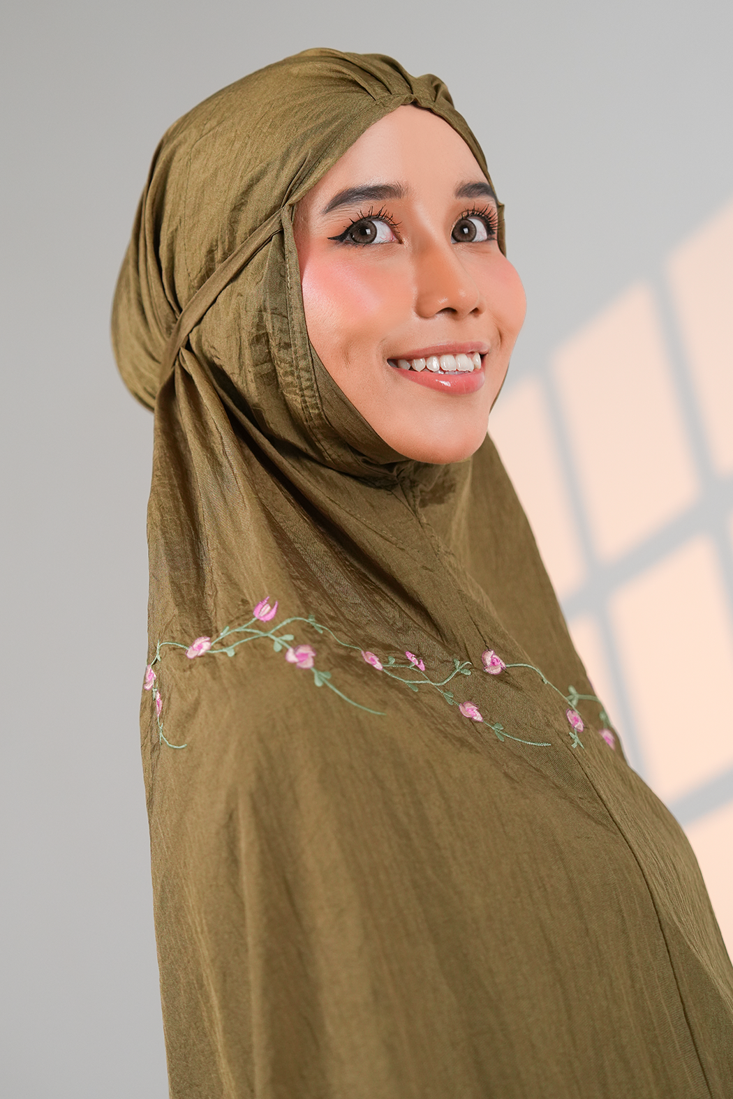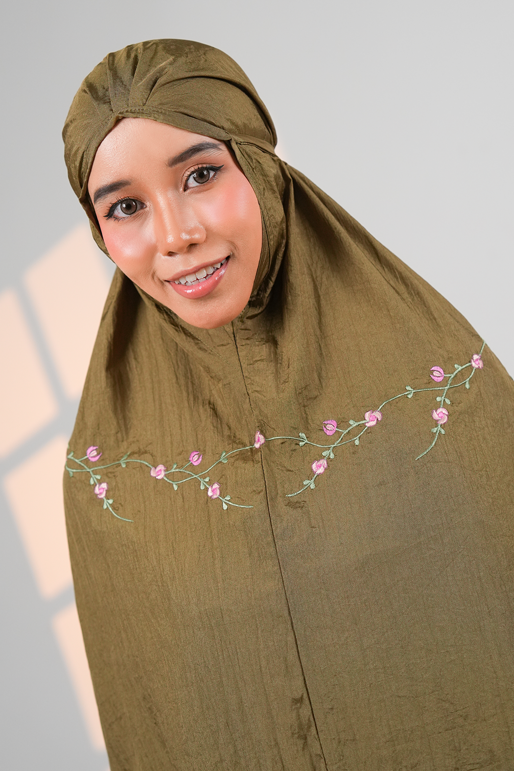 The telekung is decorated with delicate rosebud embroidery, giving it a sweet feminine touch. The smocked headband provides a secure yet comfortable fit, and it comes with a matching travel bag for easy storage and portability. Perfect for travel, work, or daily use, this telekung combines beauty with convenience.