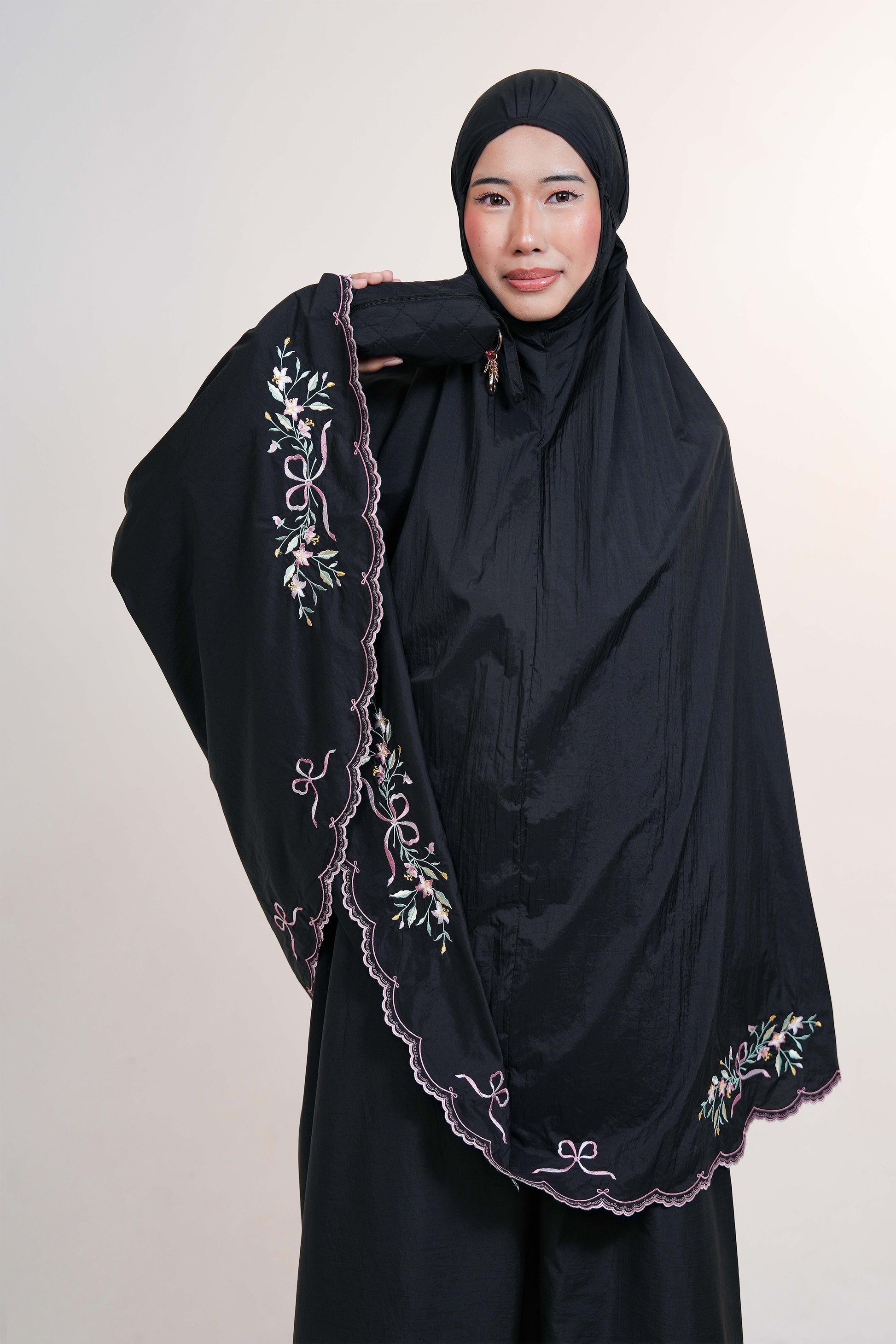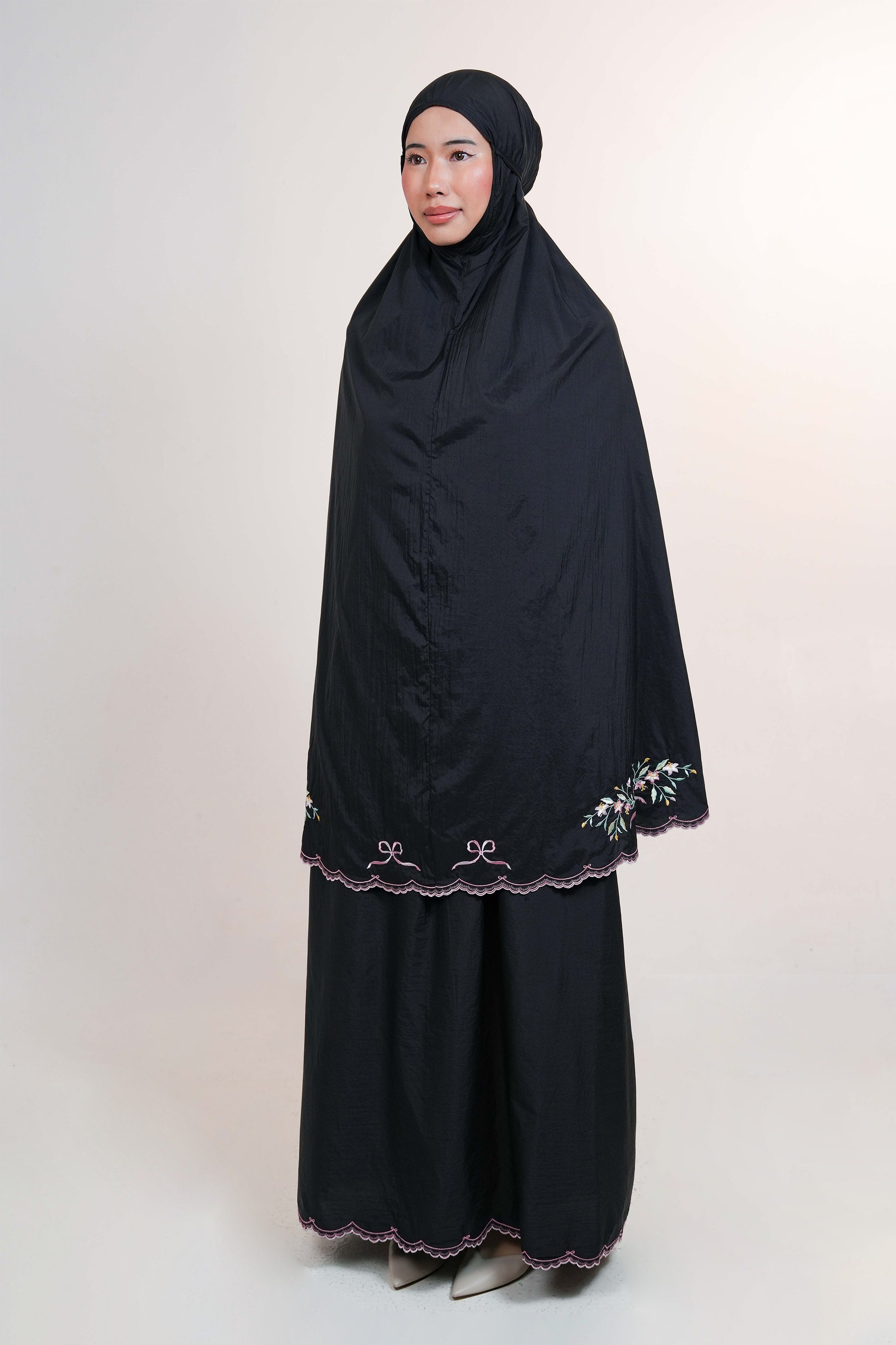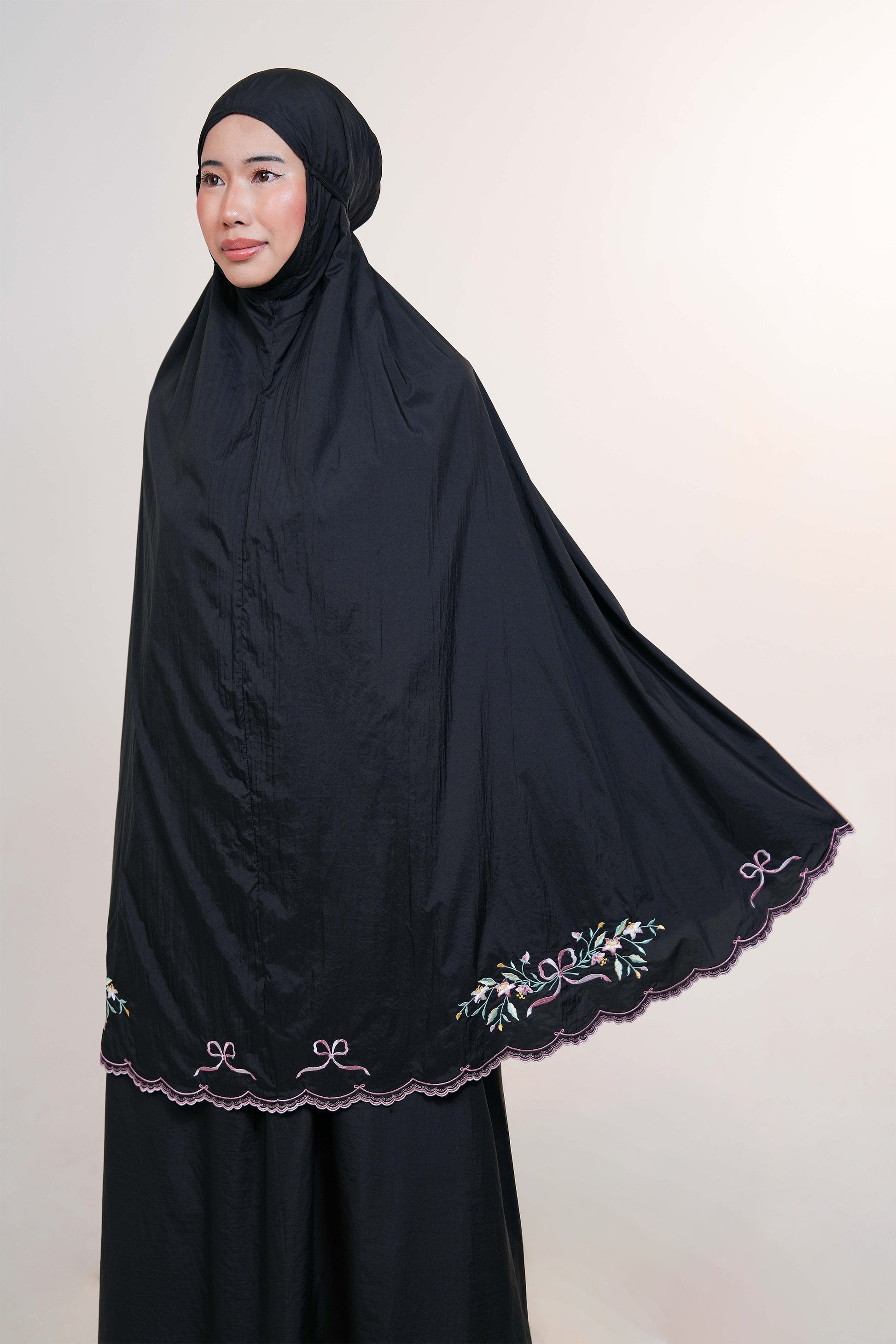 Featuring delicate ribbon and floral embroidery that frames the telekung beautifully, Whispered Grace offers a refined, feminine presence without feeling heavy or overwhelming. The embroidery along the hem adds subtle weight, allowing it to drape elegantly and stay in place without easily lifting or fluttering.