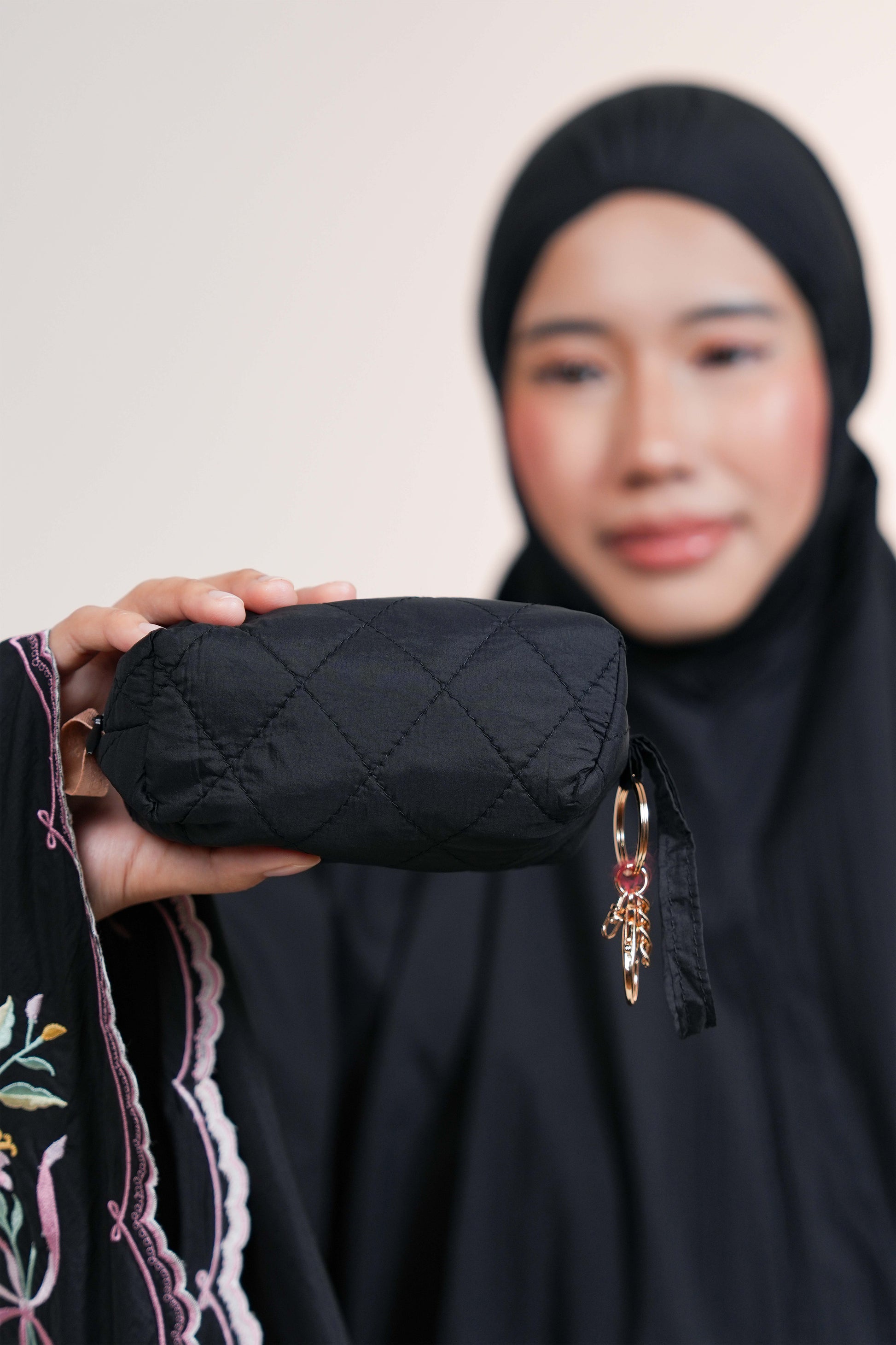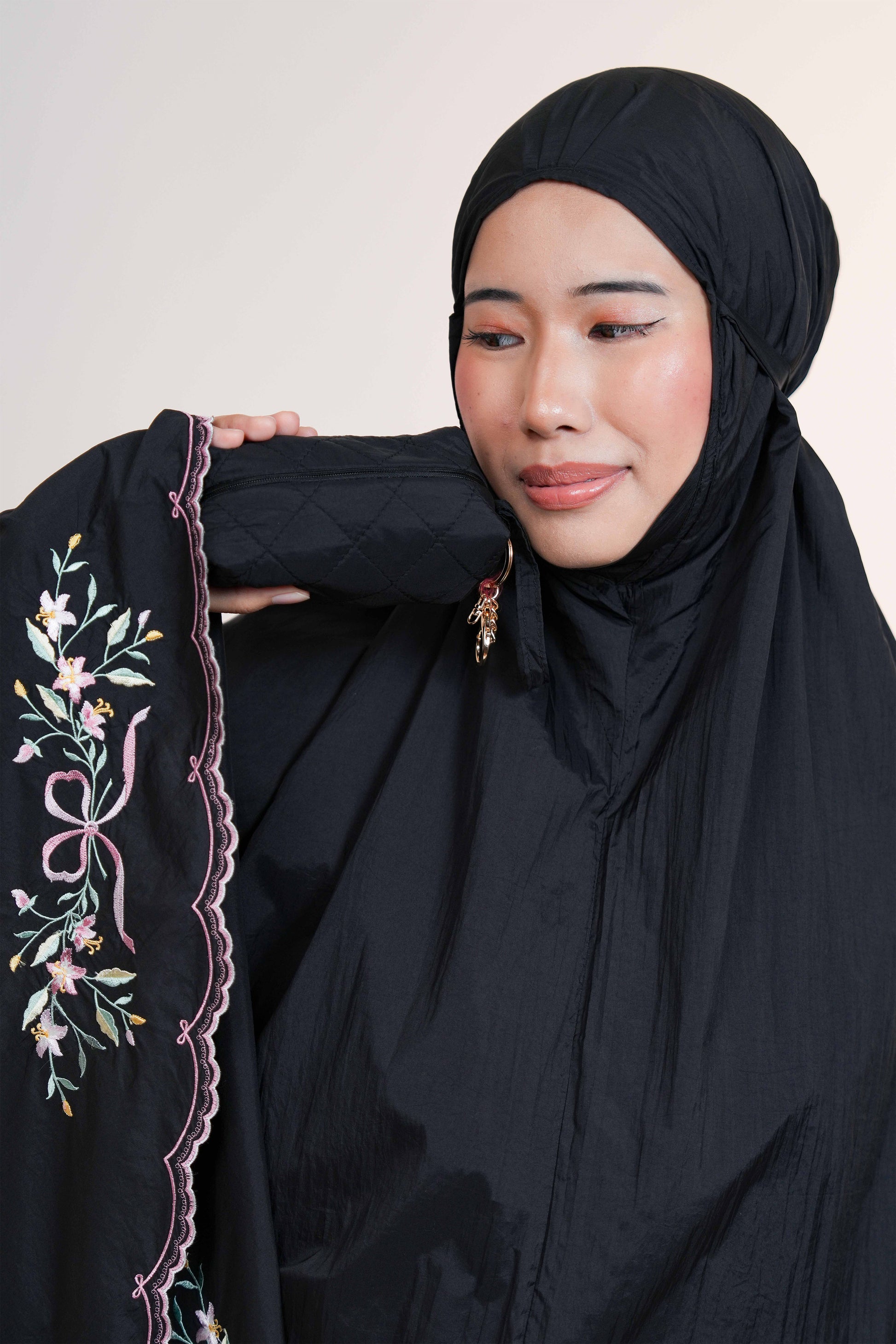 Whispered Grace is a thoughtfully designed telekung that brings together the most loved features of our bestsellers — the graceful full embroidery of our TeaBasic telekungs and the lightweight, compact ease of our pocket-sized styles.
