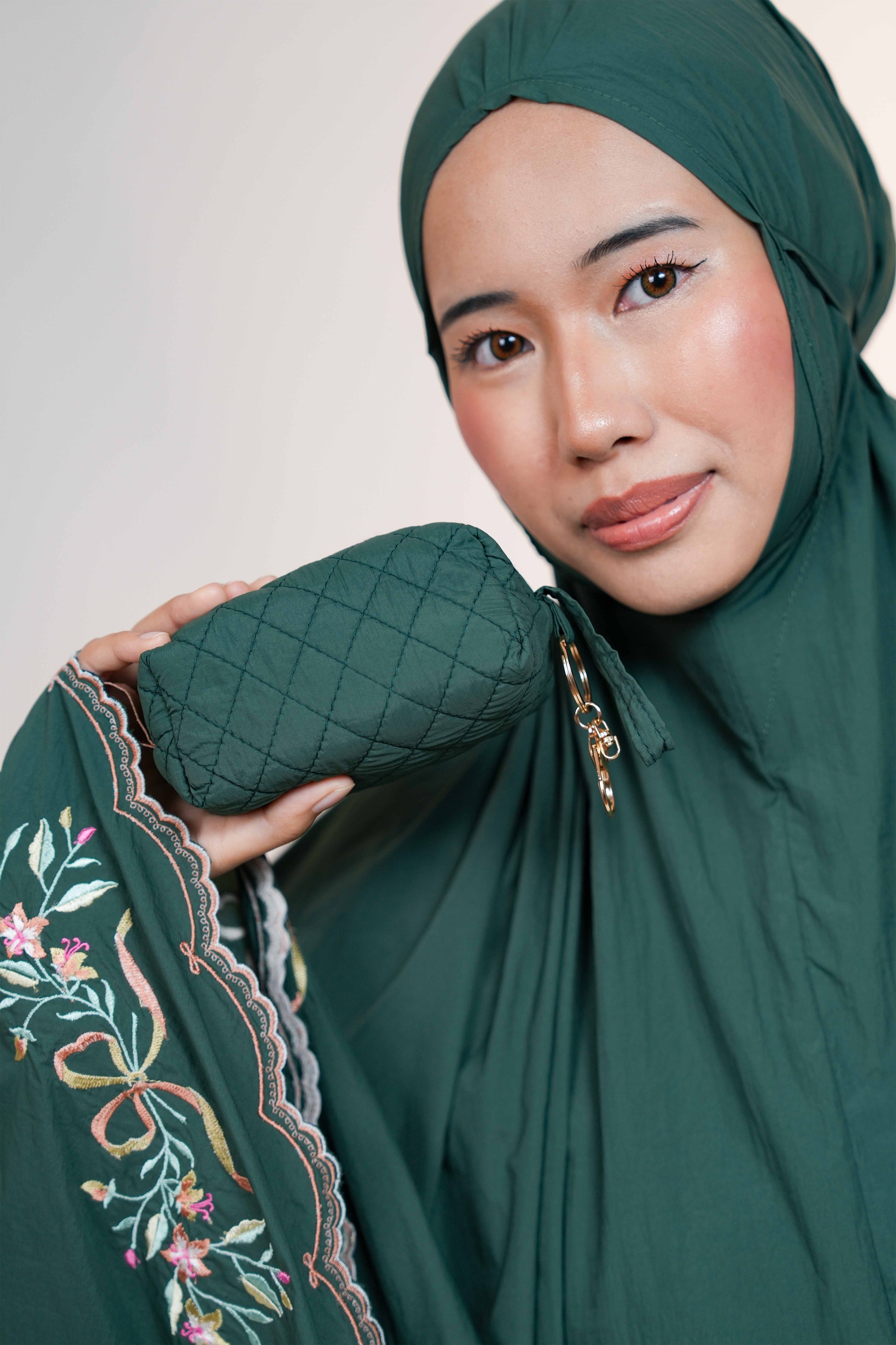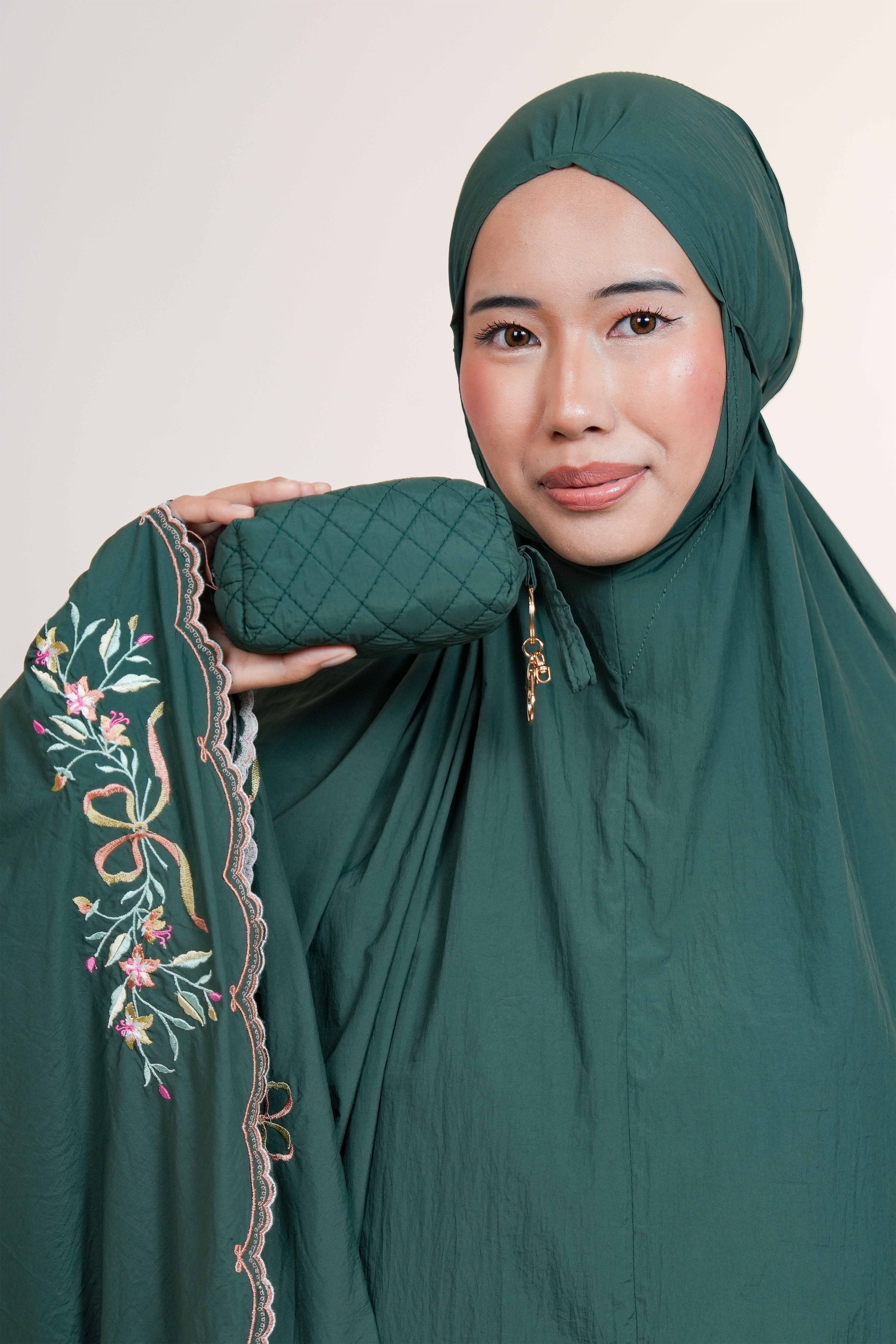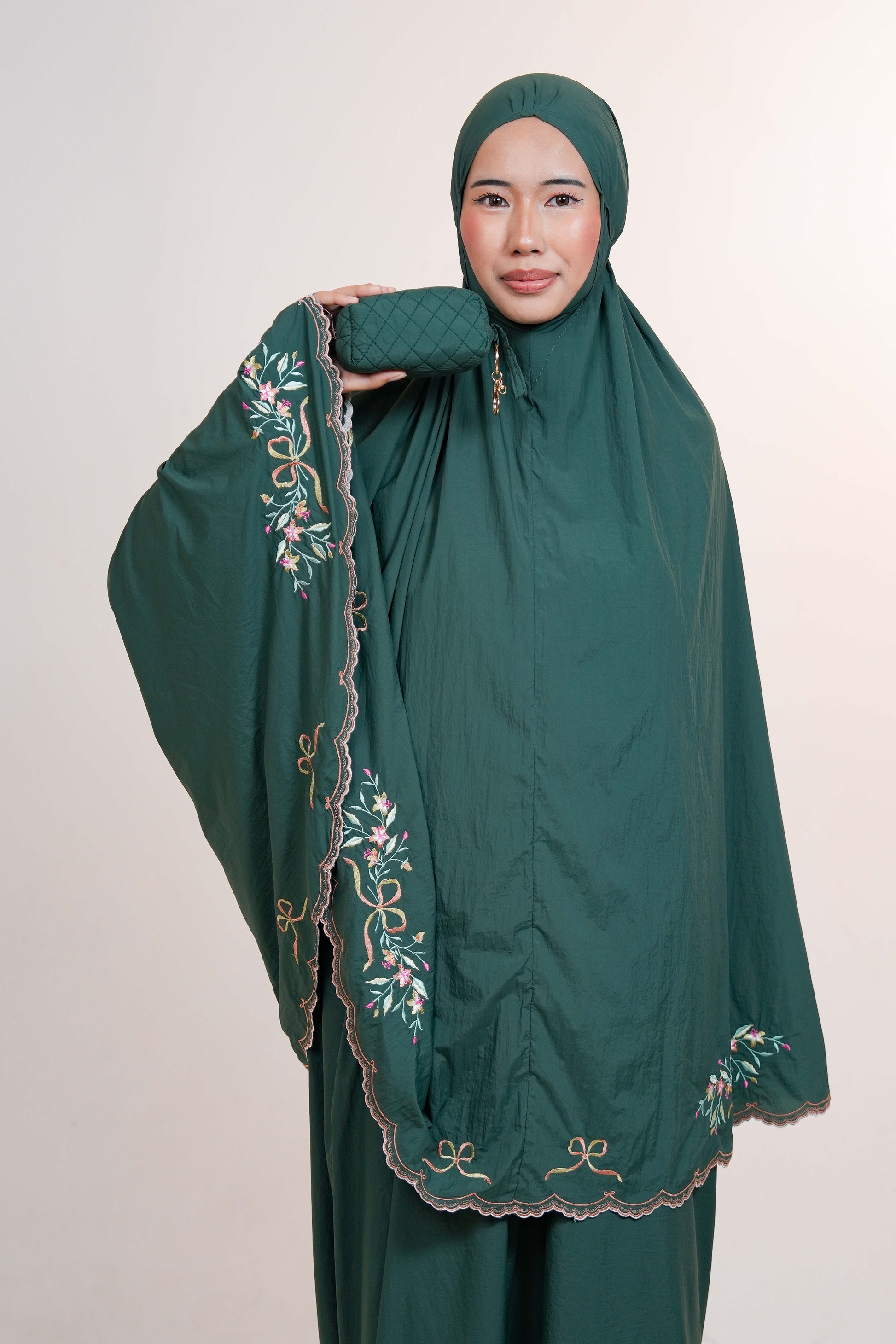 Whispered Grace is a thoughtfully designed telekung that brings together the most loved features of our bestsellers — the graceful full embroidery of our TeaBasic telekungs and the lightweight, compact ease of our pocket-sized styles.