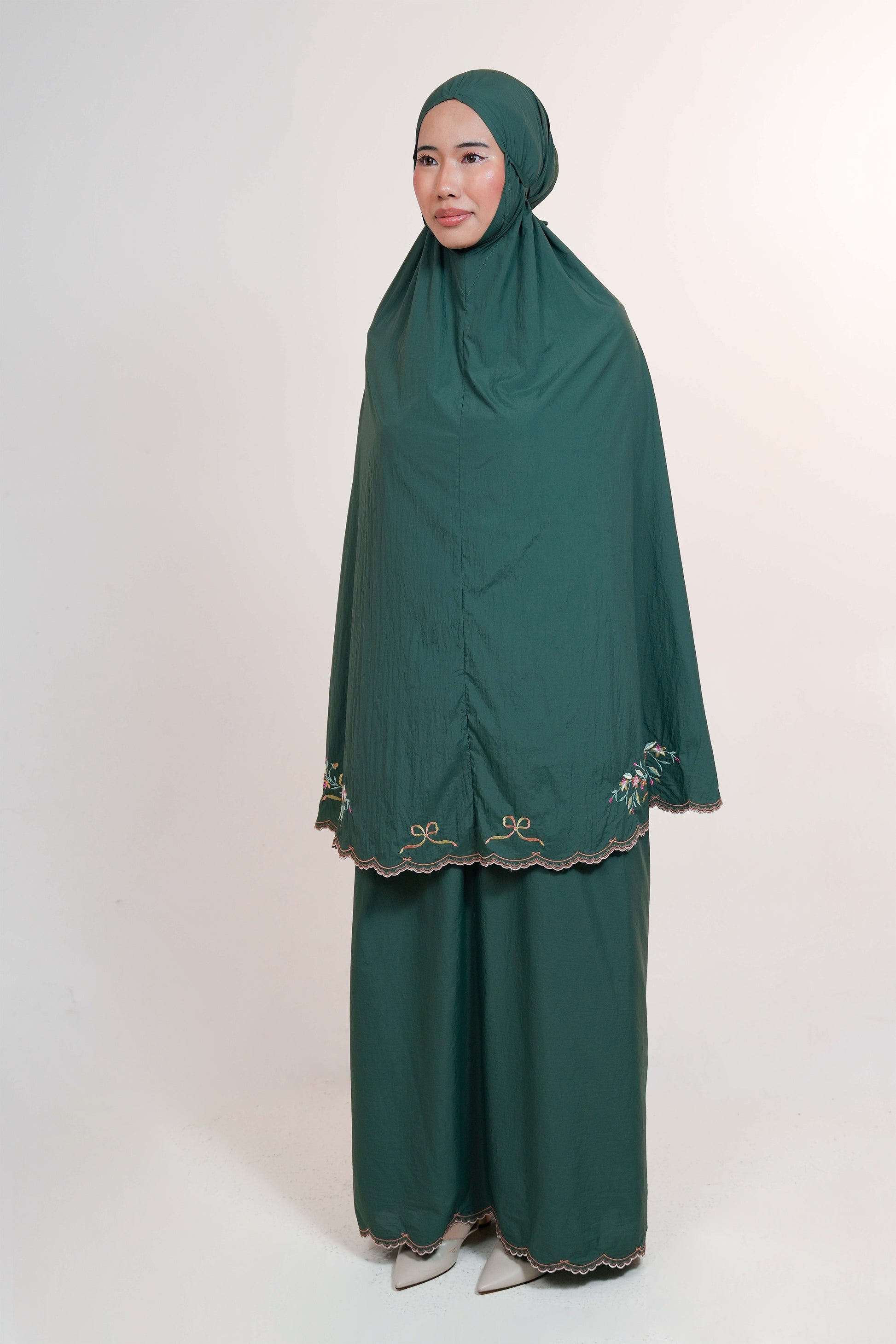Featuring delicate ribbon and floral embroidery that frames the telekung beautifully, Whispered Grace offers a refined, feminine presence without feeling heavy or overwhelming. The embroidery along the hem adds subtle weight, allowing it to drape elegantly and stay in place without easily lifting or fluttering.